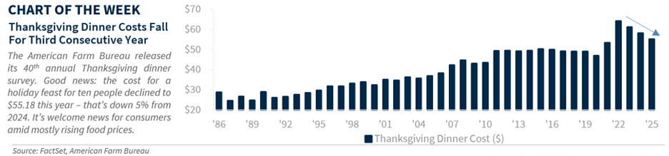 With Thanksgiving around the corner, there’s so much to be thankful for in 2025, especially for investors. After a challenging start to the year, the economy and markets regained their footing quickly, with nearly all asset classes on track for solid gains heading into year-end. Looking ahead, there are reasons for optimism to continue into 2026 as well. In the spirit of Thanksgiving, we’ve compiled ten economic and market-related things we’re most thankful for in 2025 – because gratitude isn’t just for the dinner table; it belongs in our portfolios, too.